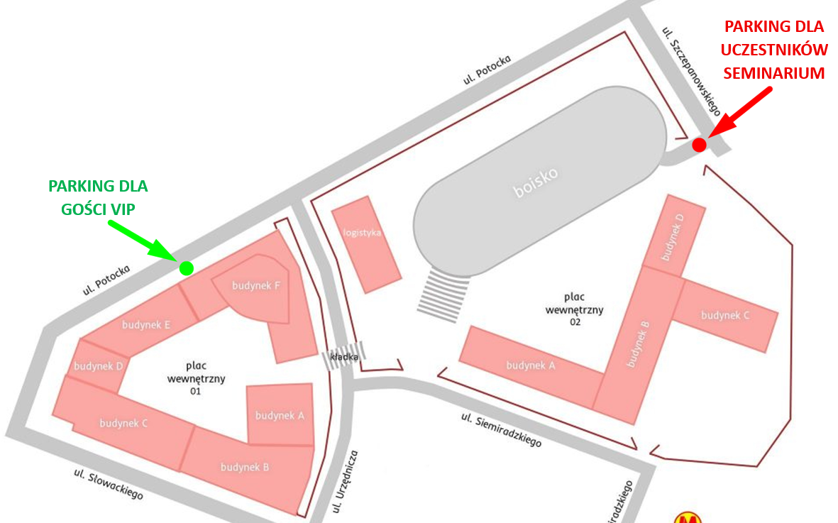 Wjazd na ten parkingu odbywa się bramą od strony ul. Szczepanowskiego, oznaczoną czerwoną kropką na poniższym rysunku. - Parking dla VIP-ów znajduje się na placu wewnętrznym obiektu 01.